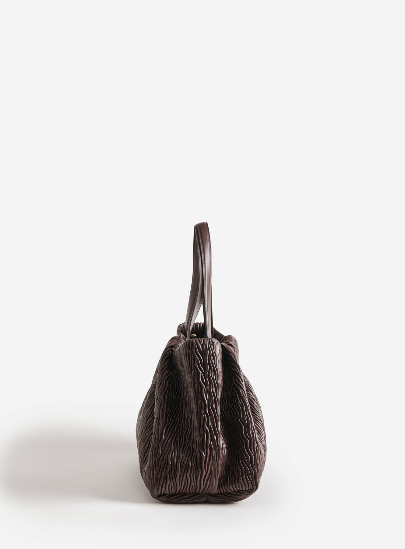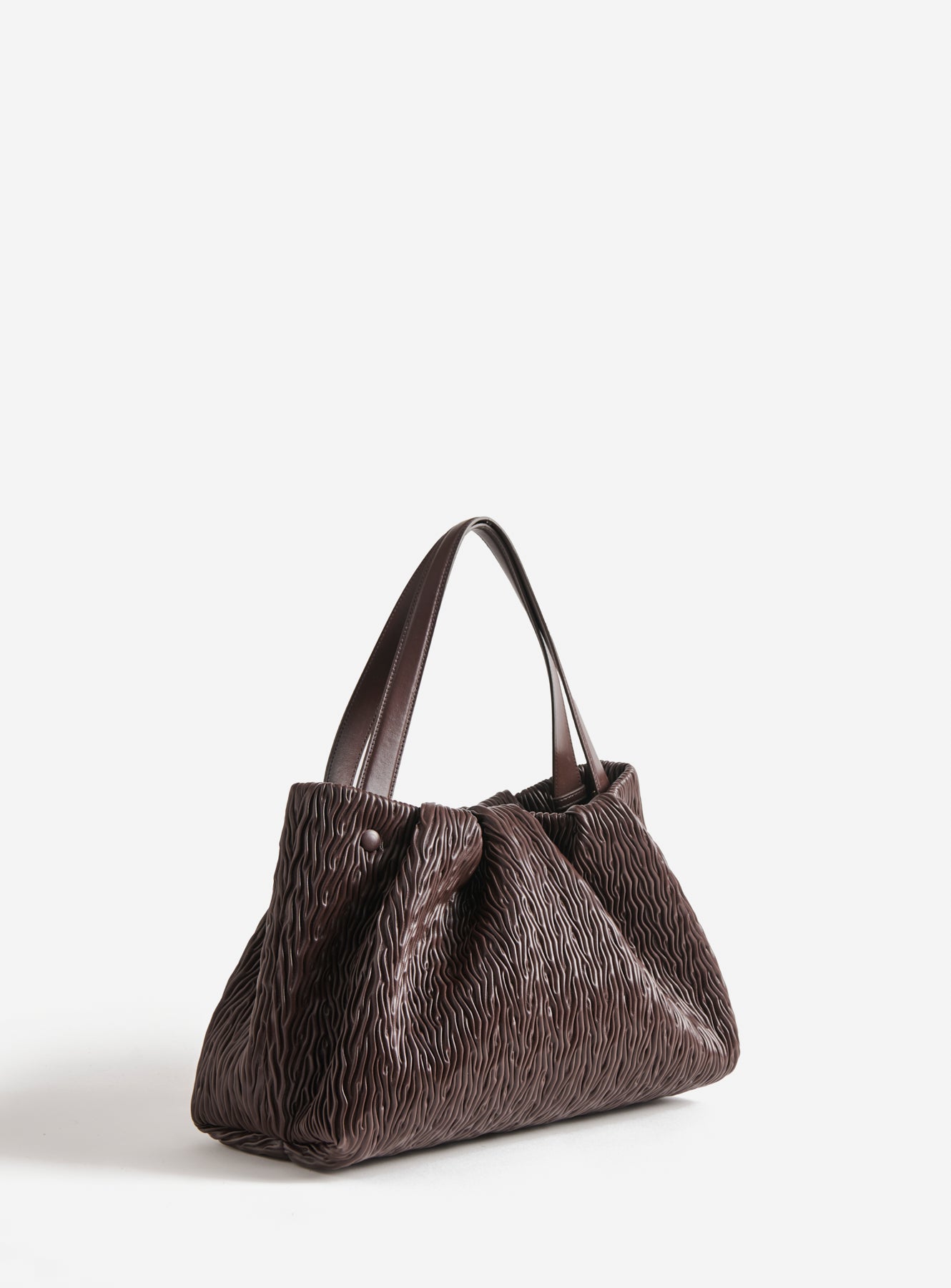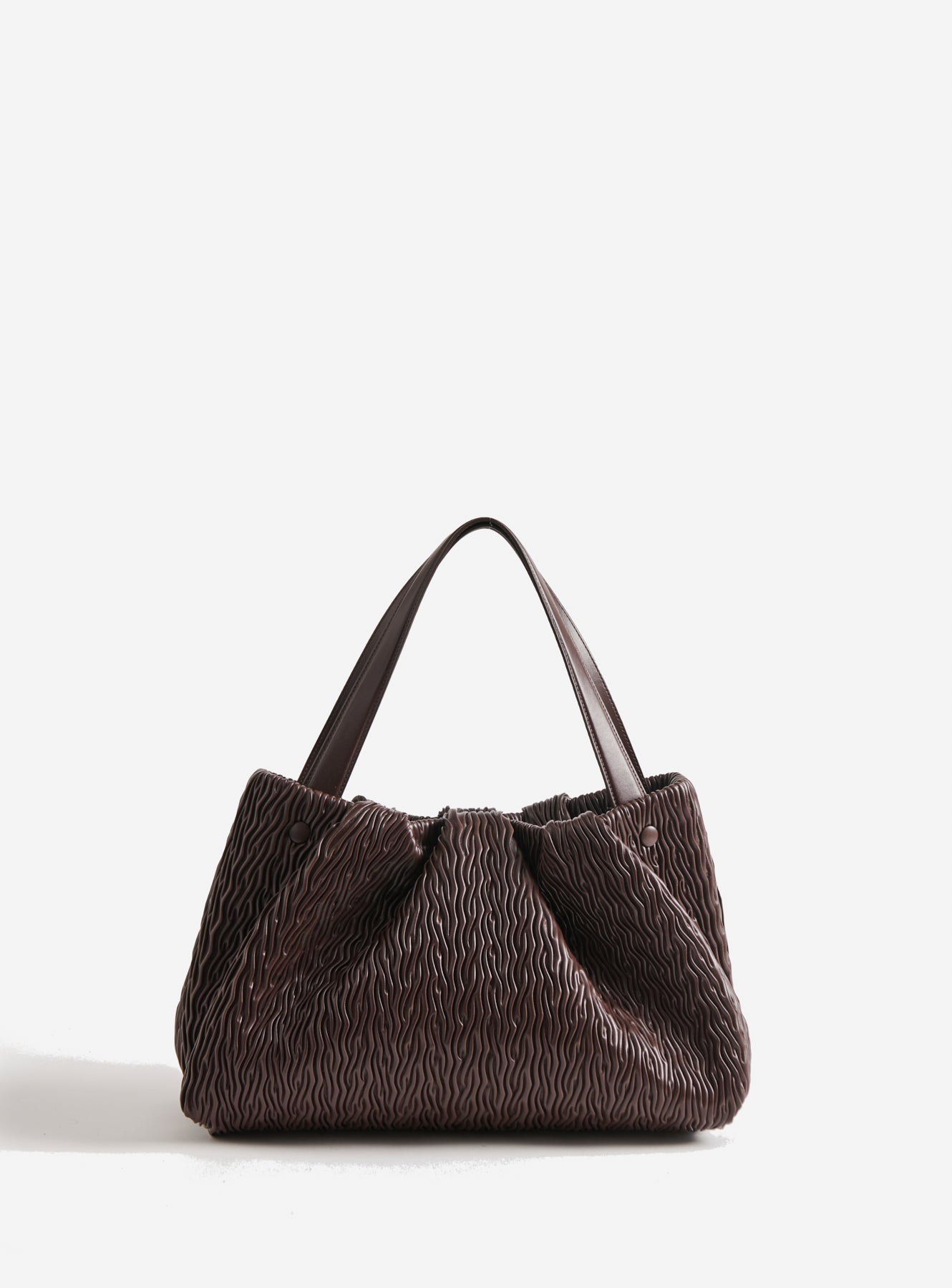 Themoirè's Athena Apple Chocolate Plum is crafted from apple-derived vegetal material, featuring a pleated texture that adds character and depth. The chocolate plum tone enhances the soft volume of the bag, creating a refined and contemporary effect. Spacious and lightweight, it can be carried by hand, on the shoulder, or as a crossbody bag with a removable strap, making it the ideal accessory for elegant and responsible daily use. The magnetic closure ensures practicality, while the innovative material expresses a sustainable and distinctive aesthetic.