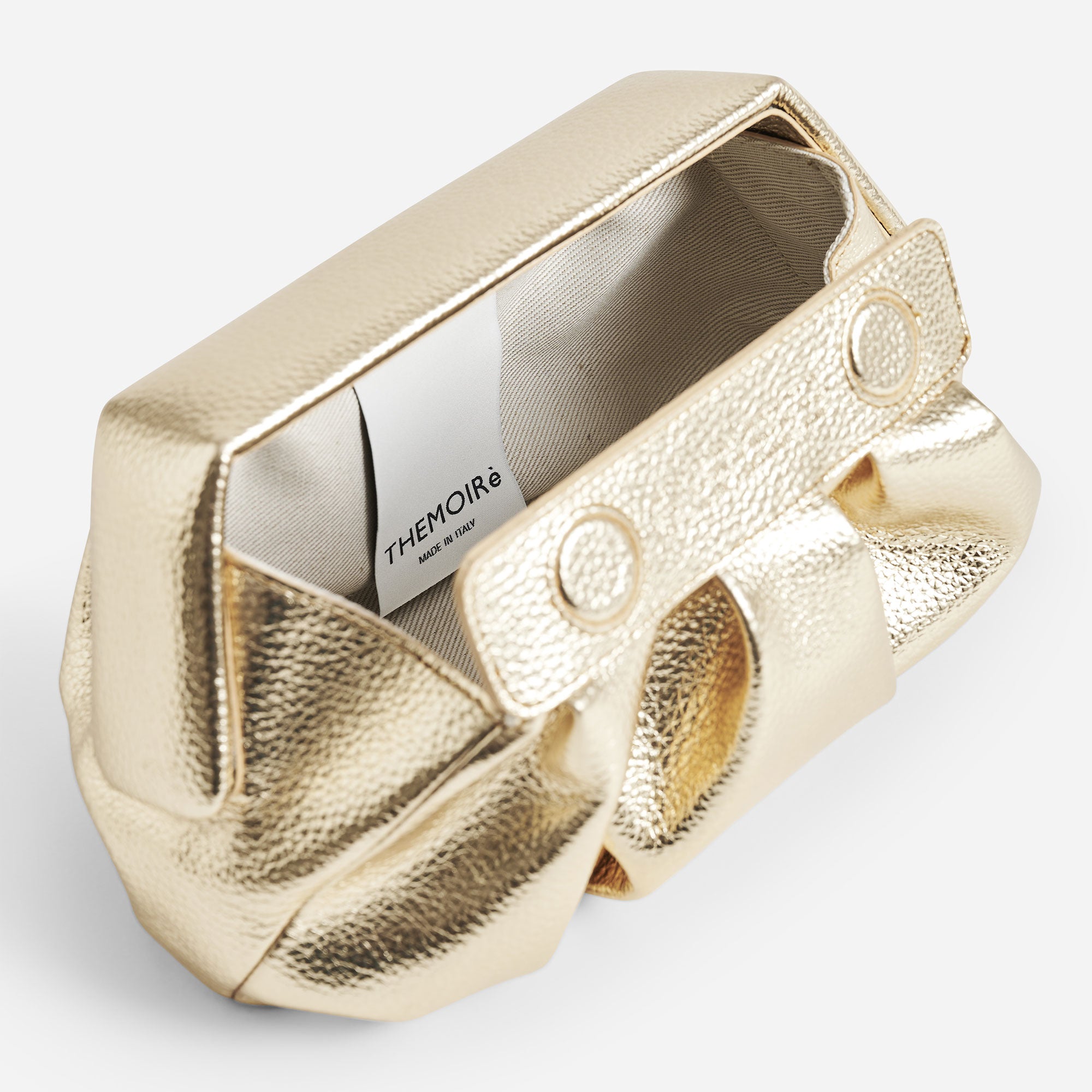 Themoirè's Athena Pochette Bottalato Laminato Oro is an elegant evening bag crafted from vegan material with a refined tumbled texture and a laminated gold finish. The compact and sculptural design enhances any cocktail look or special event, while the magnetic closure ensures practicality without sacrificing style. A sophisticated and responsible accessory, perfect for the contemporary woman who wishes to stand out with ethical elegance.