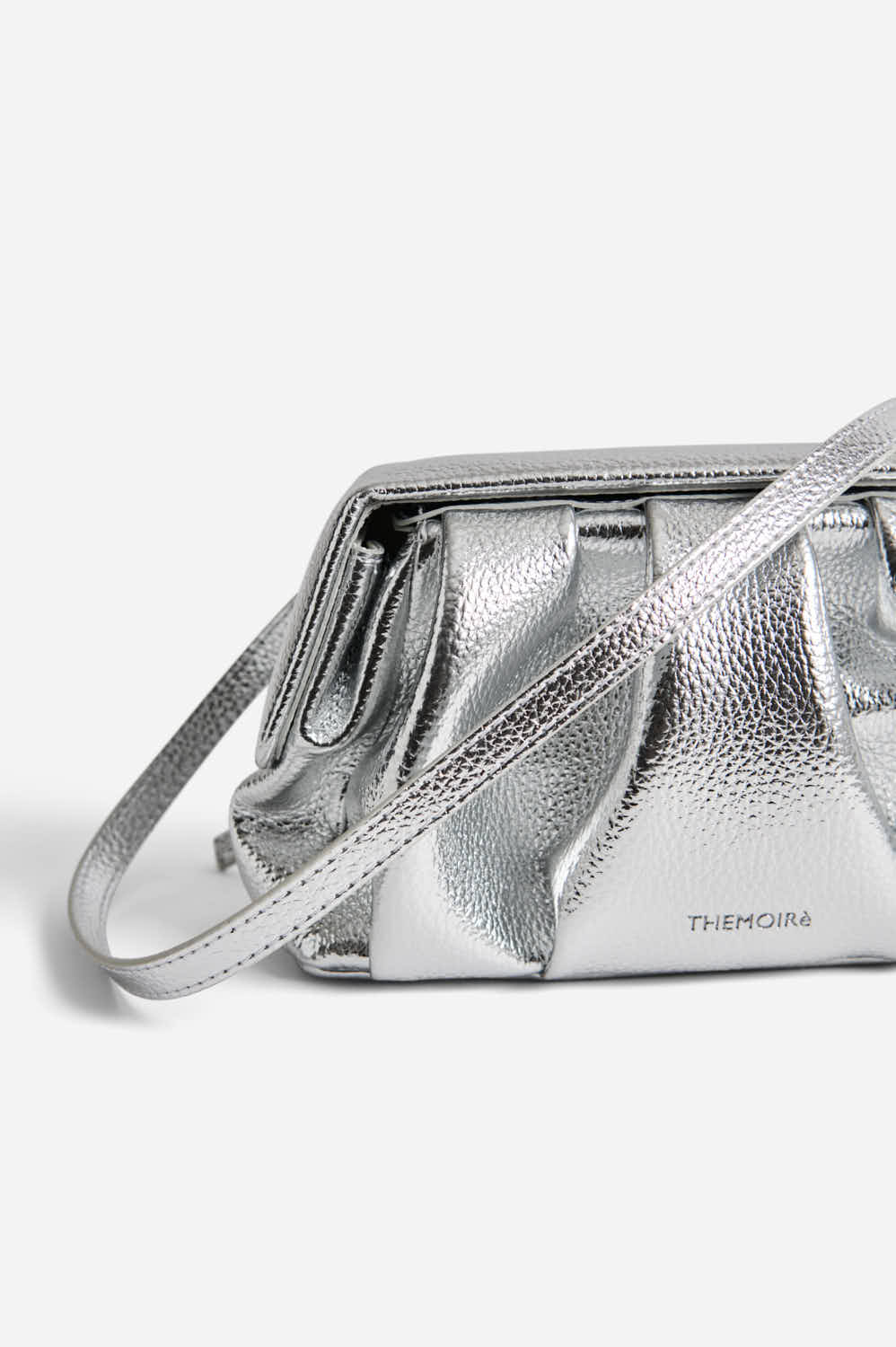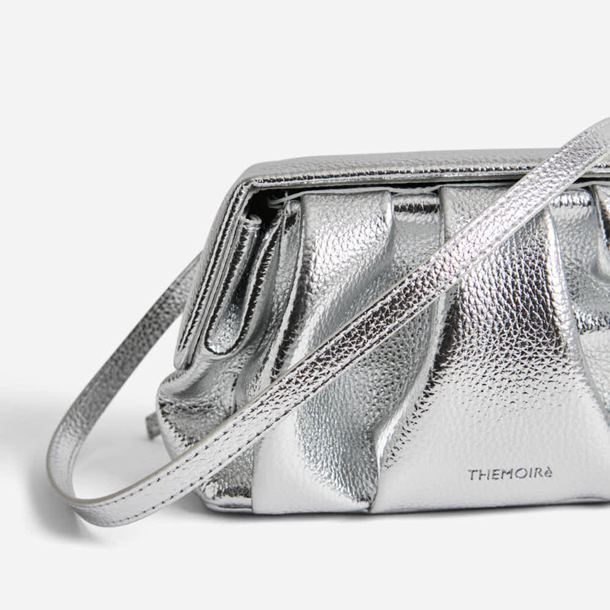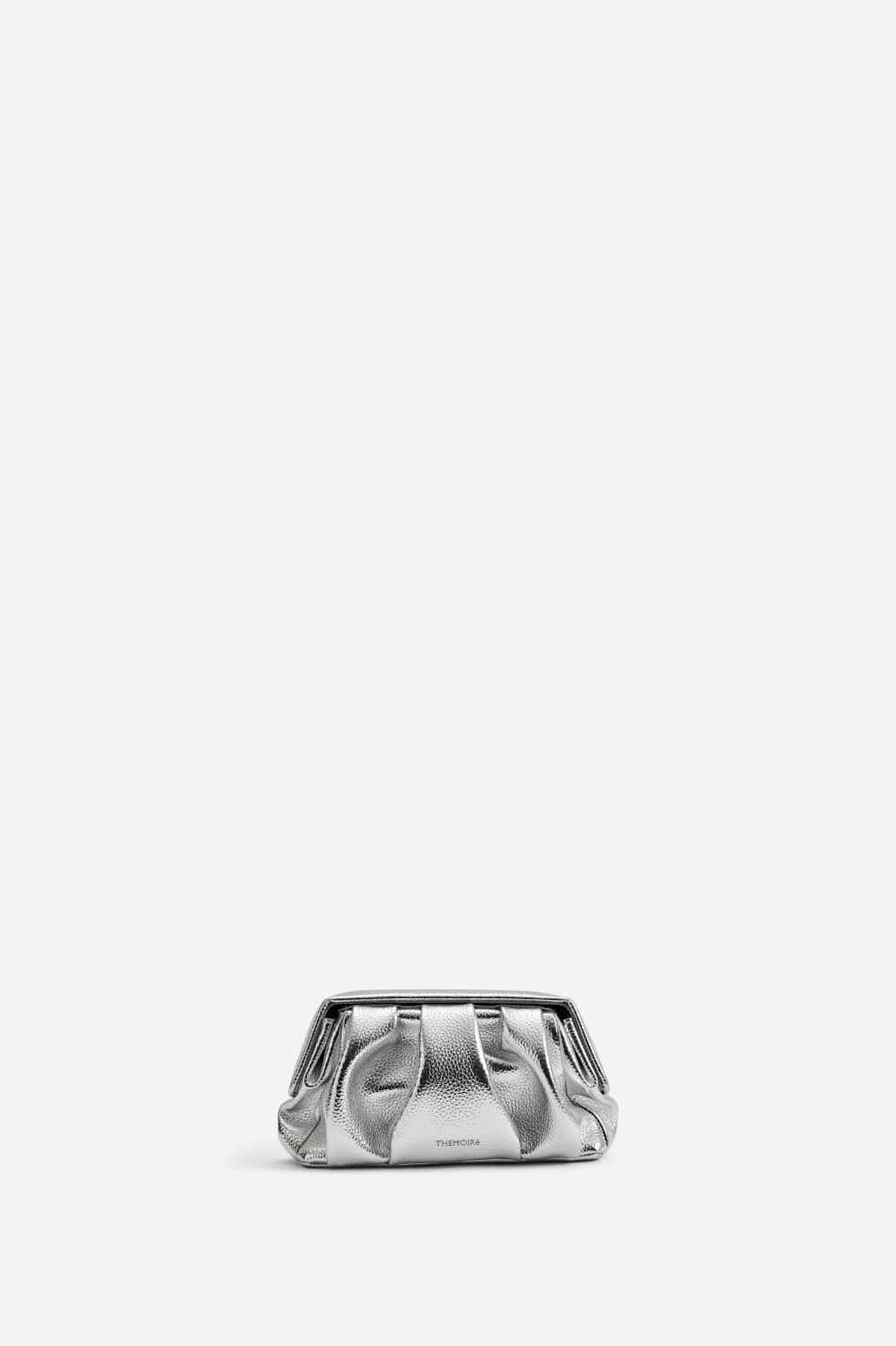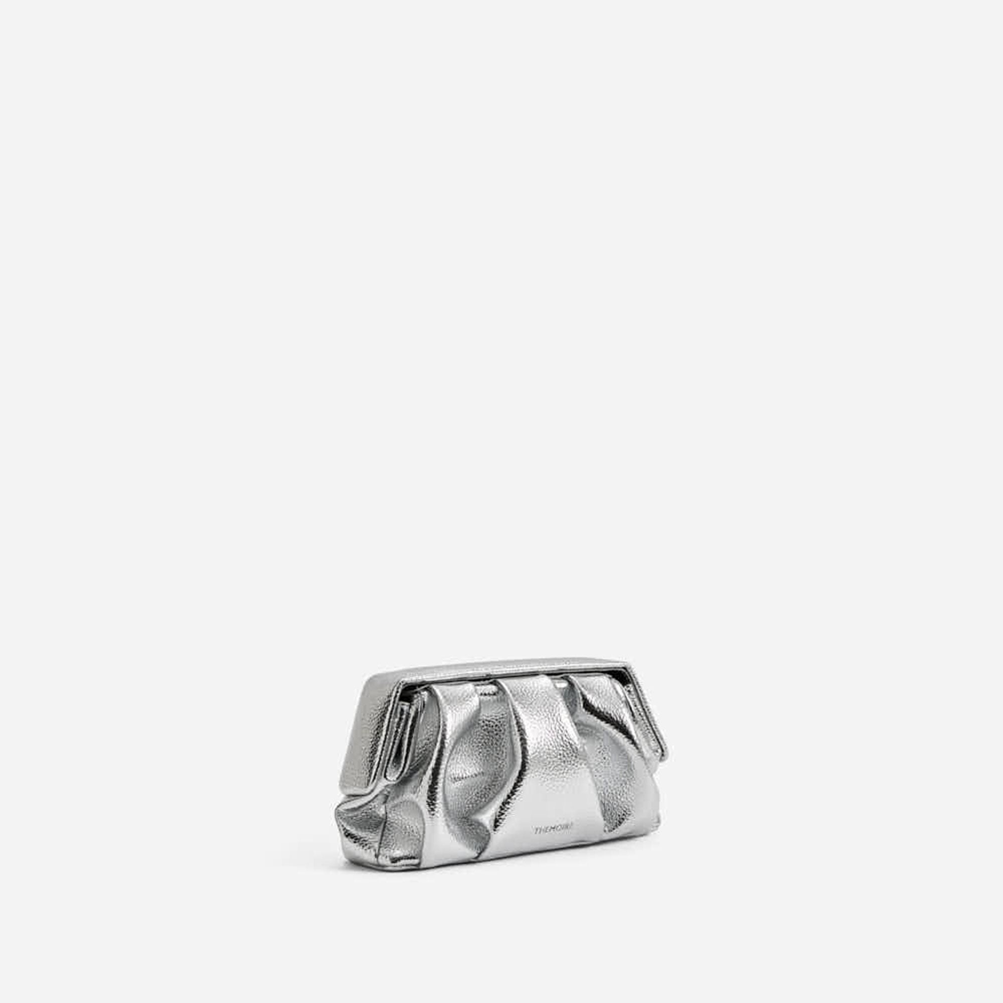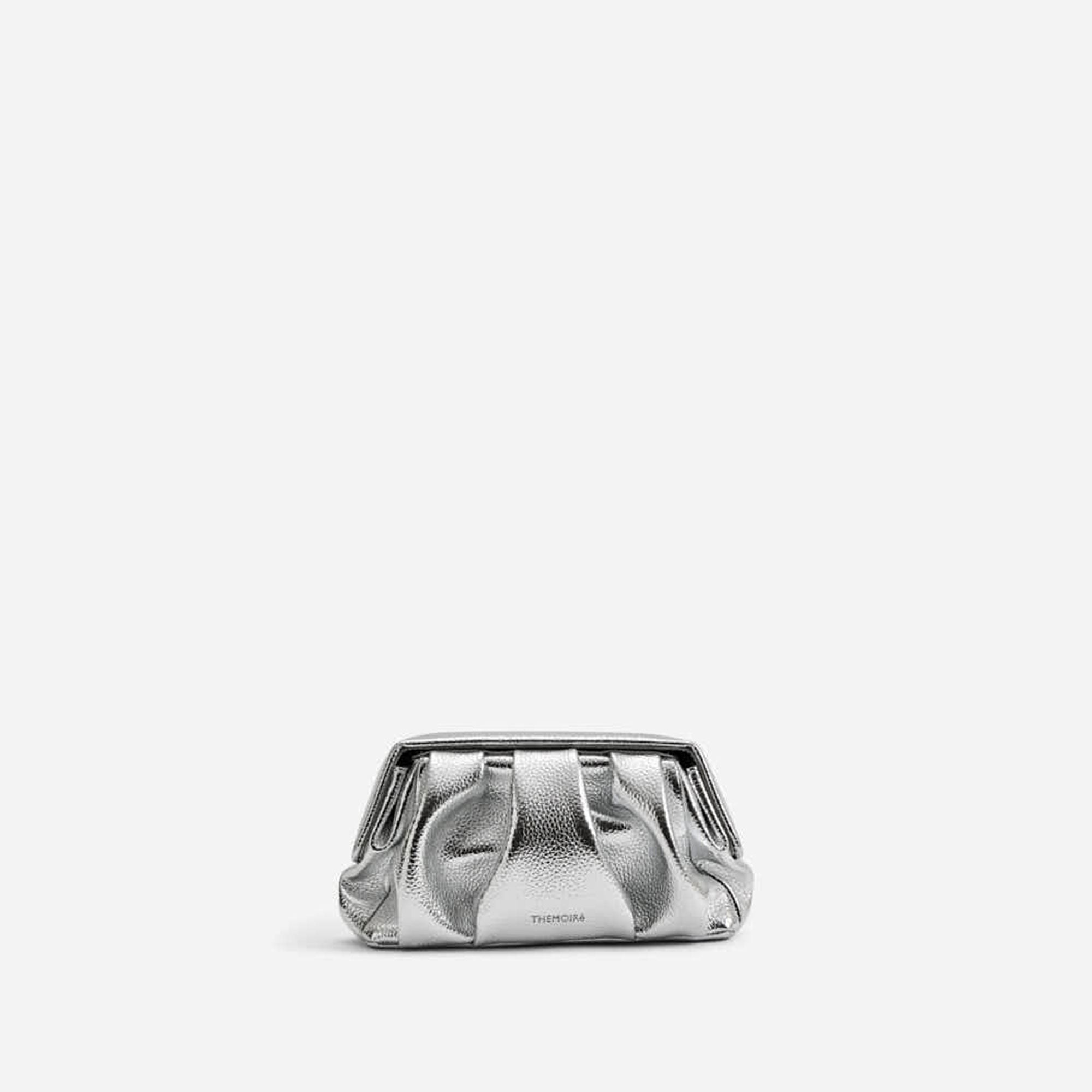 Themoirè's Athena Pochette Bottalato Laminato Silver is an elegant evening bag crafted from vegan material with a refined tumbled texture and a laminated silver finish. The compact and sculptural design enhances any cocktail look or special event, while the magnetic closure ensures practicality without sacrificing style. A sophisticated and responsible accessory, ideal for the contemporary woman who wishes to shine with ethical elegance.