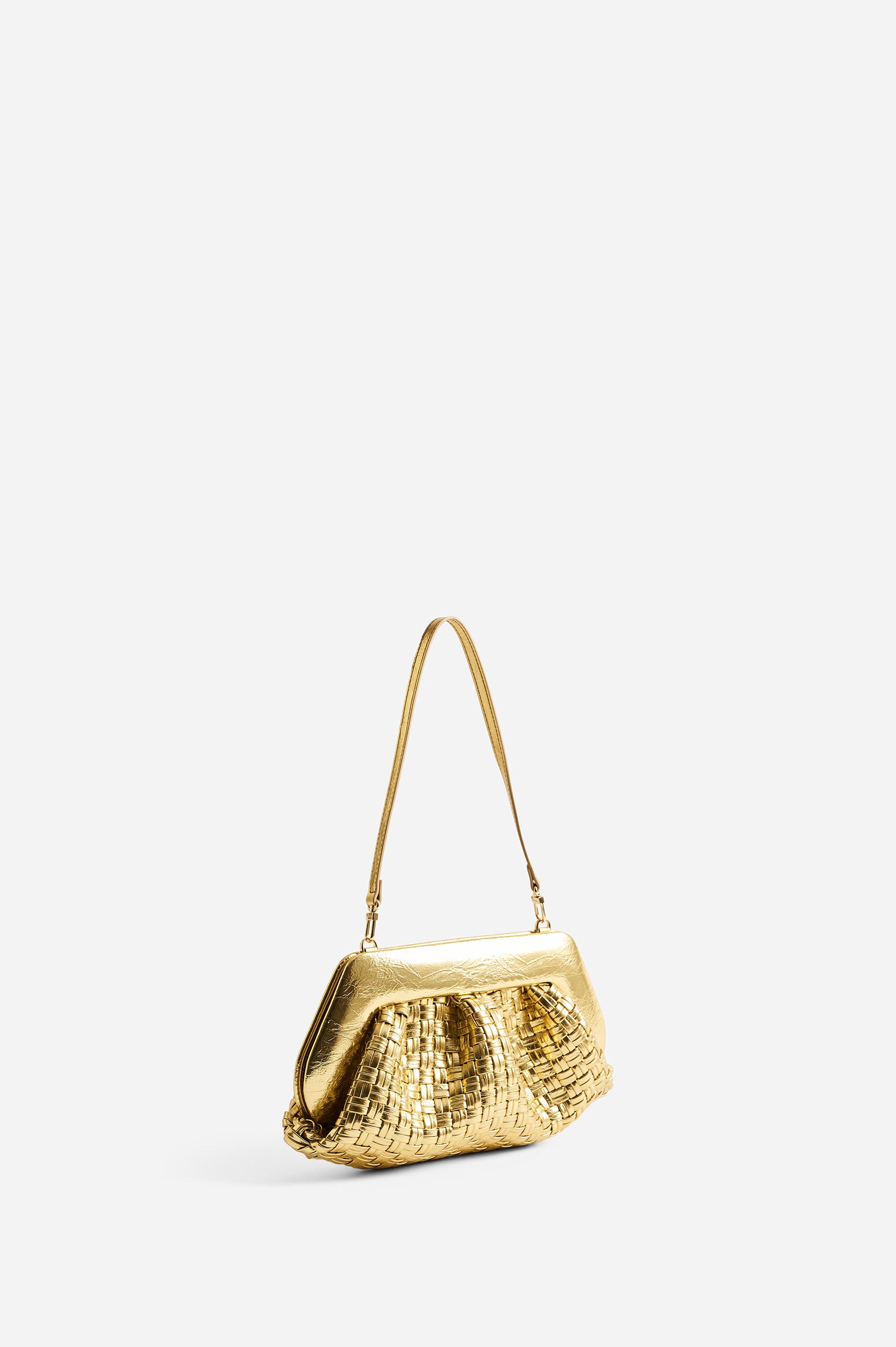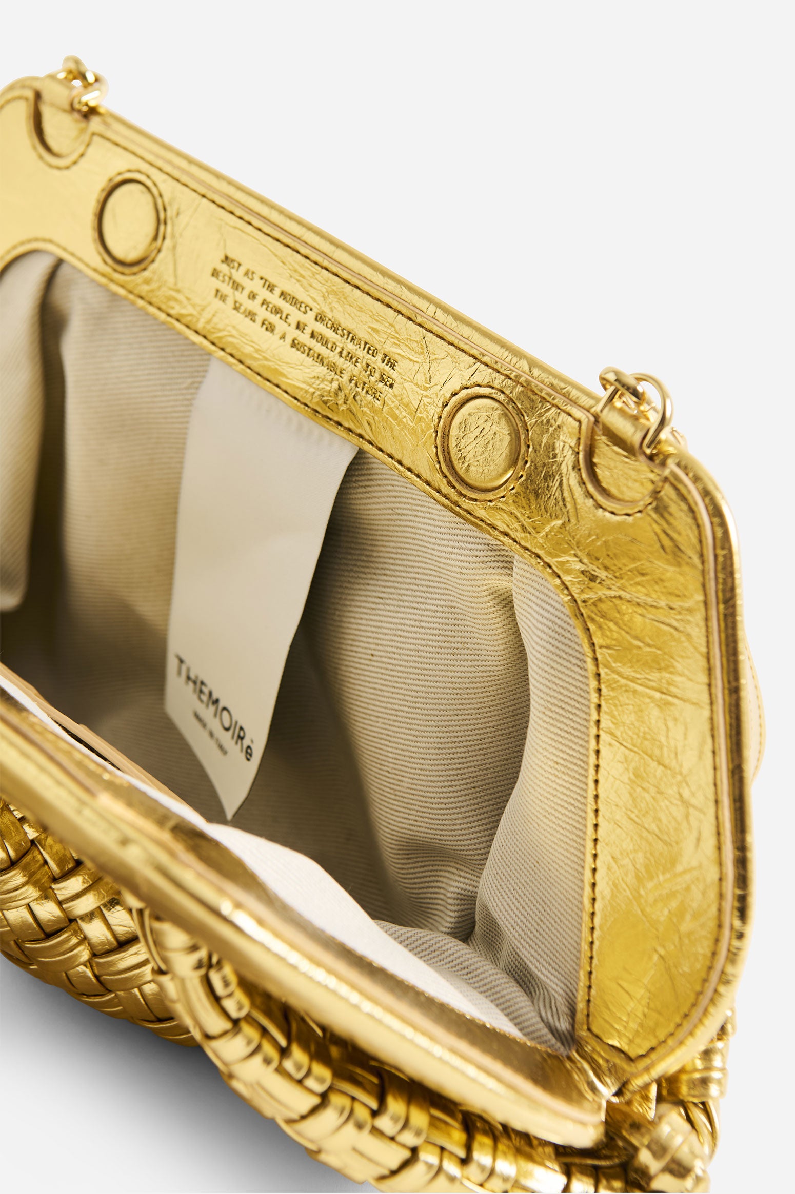 Emera Micro Weaved Laminated Gold di Themoirè è una borsa elegante dal look deciso, realizzata in materiale vegano laminato e riciclato con un raffinato mini intreccio. Compatta ma capiente, è ideale per completare outfit urbani e sofisticati.