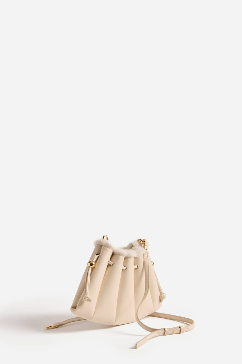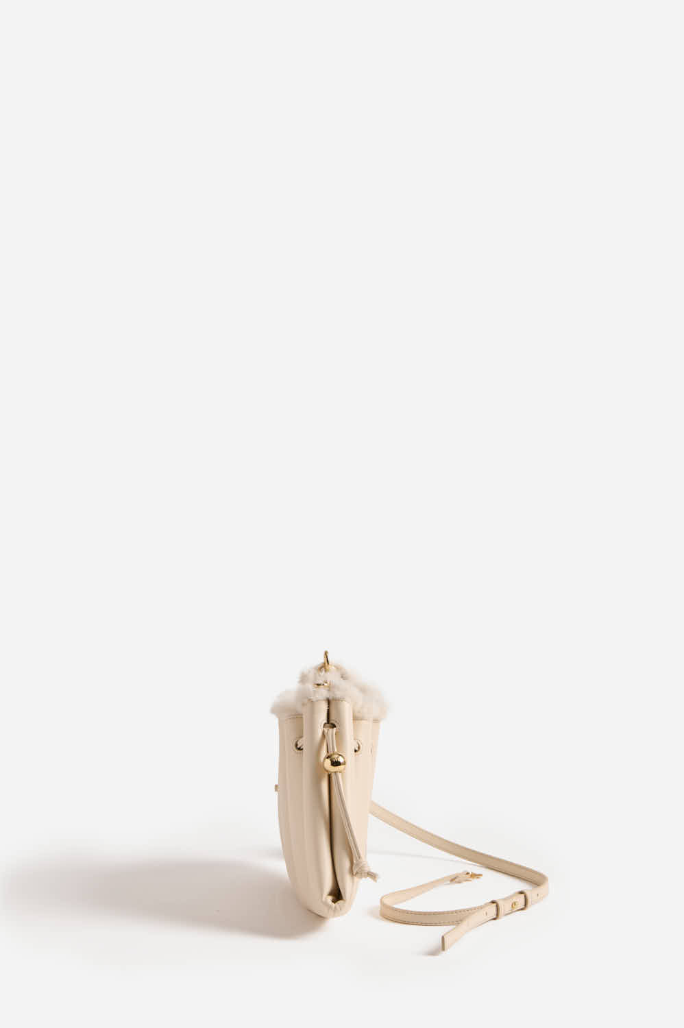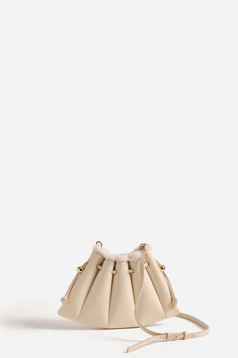 La borsa Dafne Fur Edges Shell è un accessorio statement che combina forme scultoree e texture avvolgenti. La struttura a pieghe color Shell si apre a ventaglio e si chiude tramite coulisse. Il dettaglio distintivo è il soffice bordo in eco-pelliccia che crea un contrasto giocoso ed elegante. Dotata di tracolla regolabile, unisce lo stile iconico alla praticità quotidiana, sempre realizzata in materiali vegani e sostenibili.