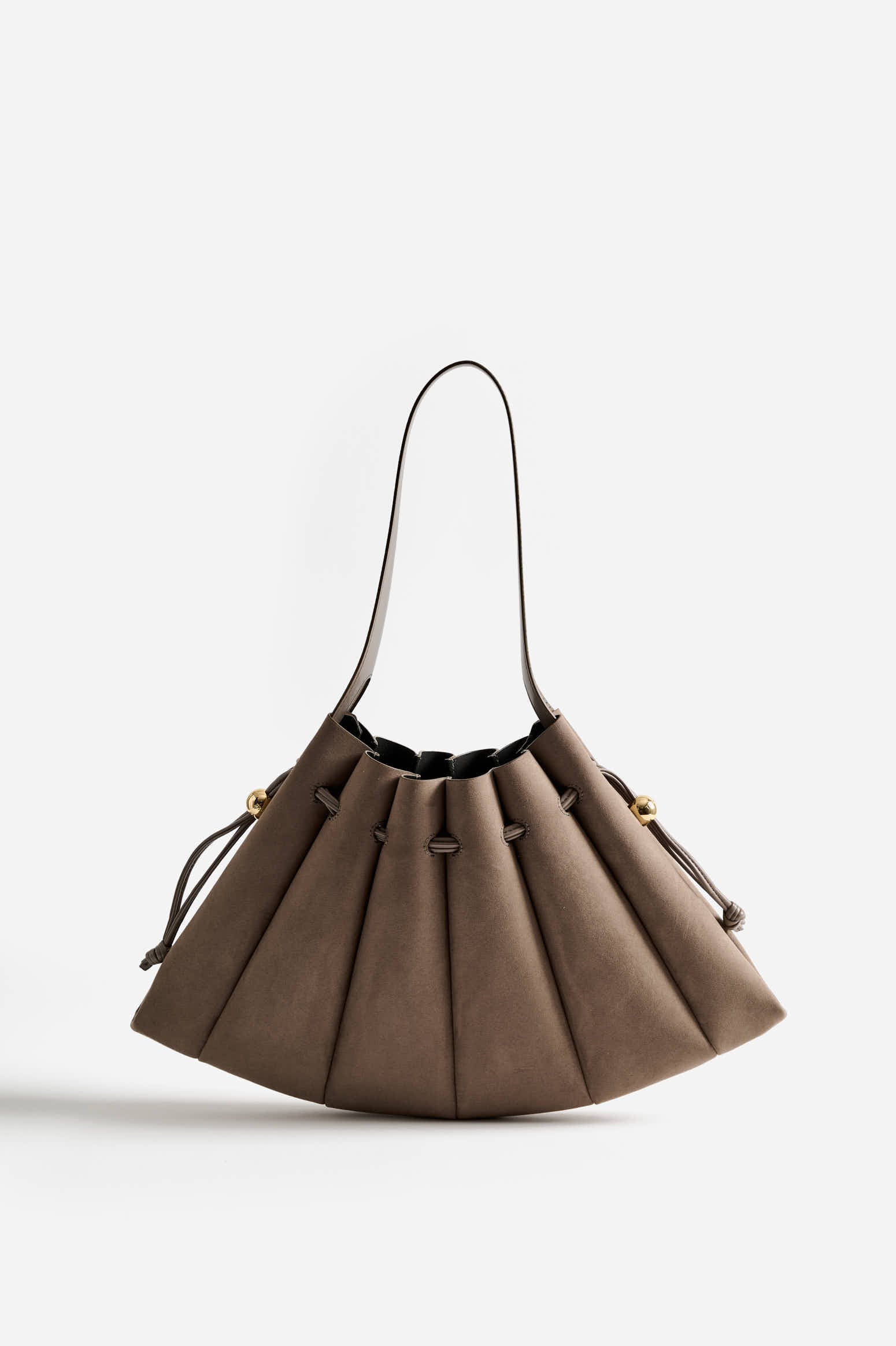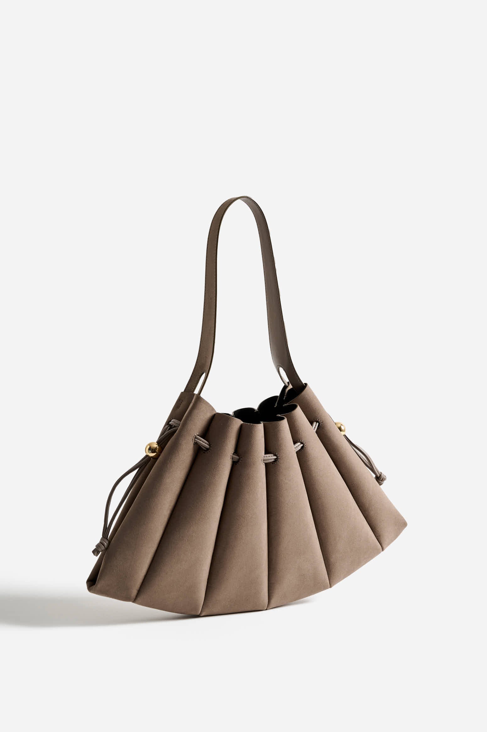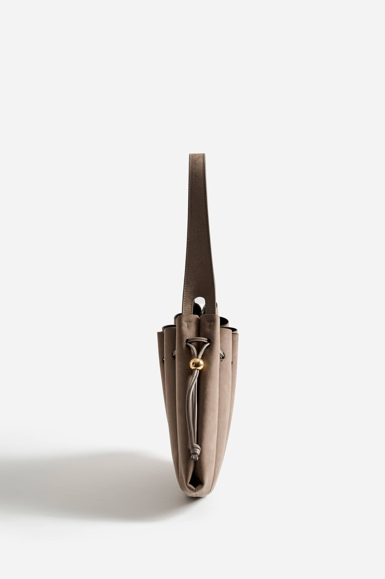 Calipso Suede Mu di Themoirè si distingue per la nuance intensa e vibrante, che accende la texture vellutata del suede vegetale. Il design a pieghe ricorda la forma del bamboo, simbolo di equilibrio e leggerezza. Una borsa unica per uno stile consapevole