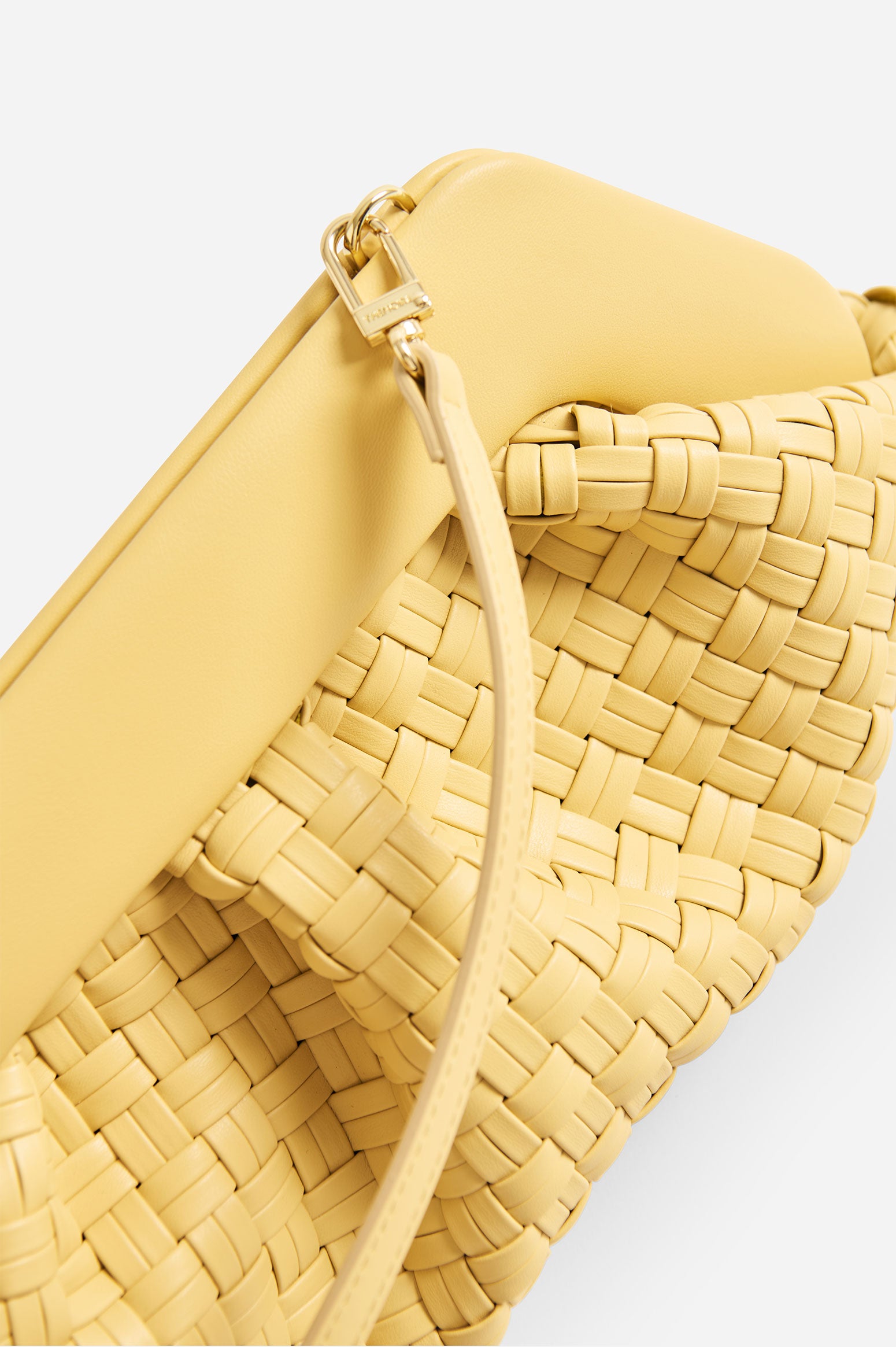Emera Micro Weaved Jojoba di Themoirè è una borsa elegante dal look deciso, realizzata in materiale vegano riciclato con un raffinato mini intreccio. Compatta ma capiente, è ideale per completare outfit urbani e sofisticati.